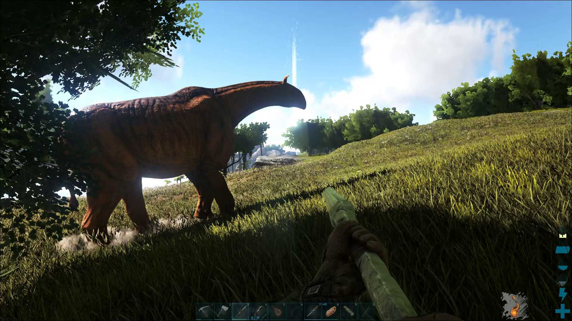В джунглях я отрываю ветку от дерева, привязываю ее к скале, а затем у меня есть каменный топор. Базовые инструменты помогают мне получить больше деревьев и камней, начав свой путь по истории технологий, созданных человеком. В отличие от многих других игр на выживание, Арк изучает технологии до конца: этот каменный топор в конечном итоге приводит к гранатометам, промышленным кузницам и силовым полям.