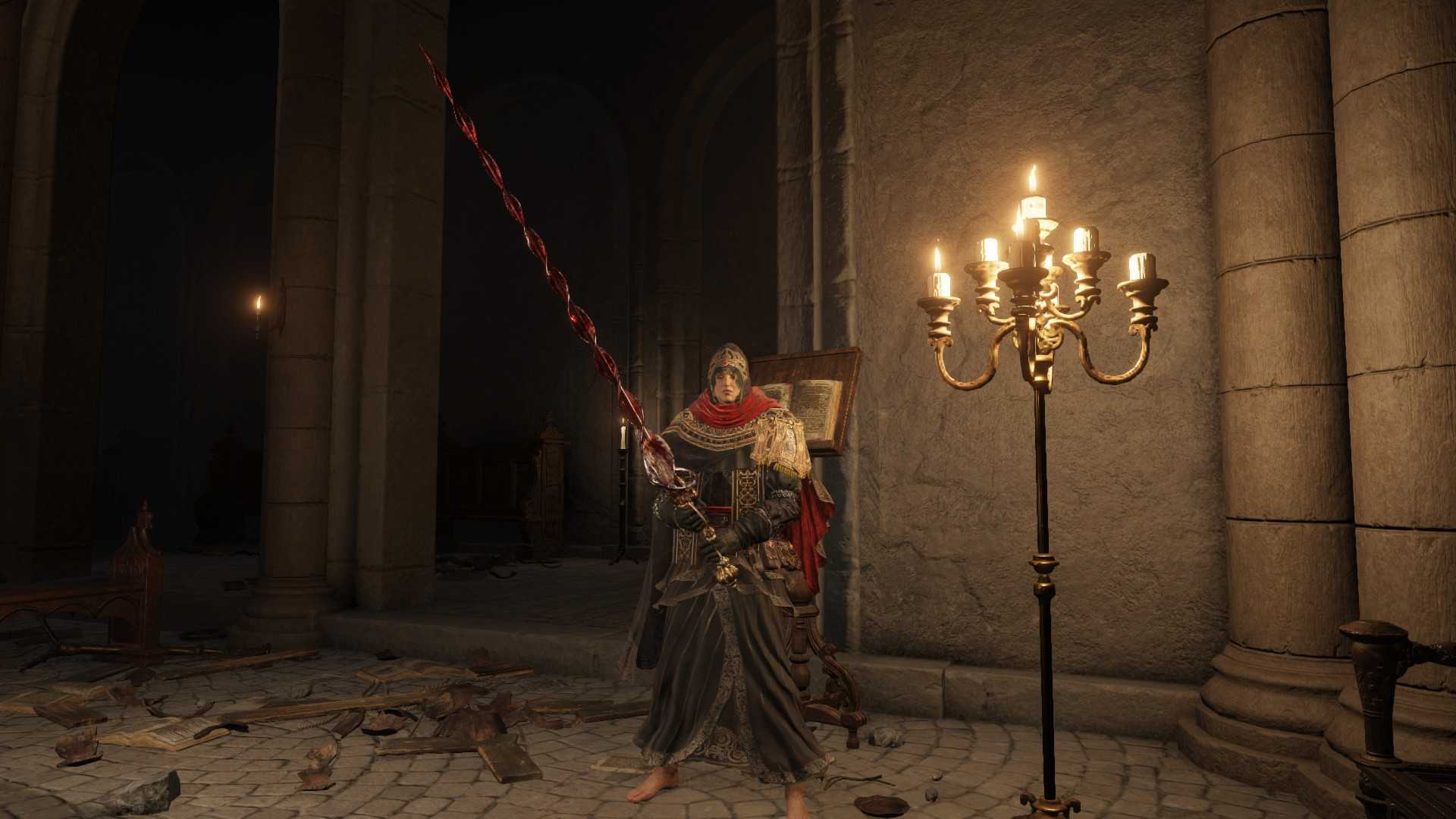 С применением билда все довольно просто. Сначала используйте молитвы Пламя, даруй мне силу и Золотой обет, а потом выпивайте флягу лазурных звезд и чудесное снадобье (последние два можно пропустить, если вы сражаетесь со слабыми врагами). Если вы еще не достали копье, то пока используйте оккультные Изогнутые мечи гробокопателя, применив перед этим Сэппуку. В ином случае подойдите к противнику на среднюю дистанцию и примените способность трезубца, чтобы нанести врагу огромный урон кровотечением.