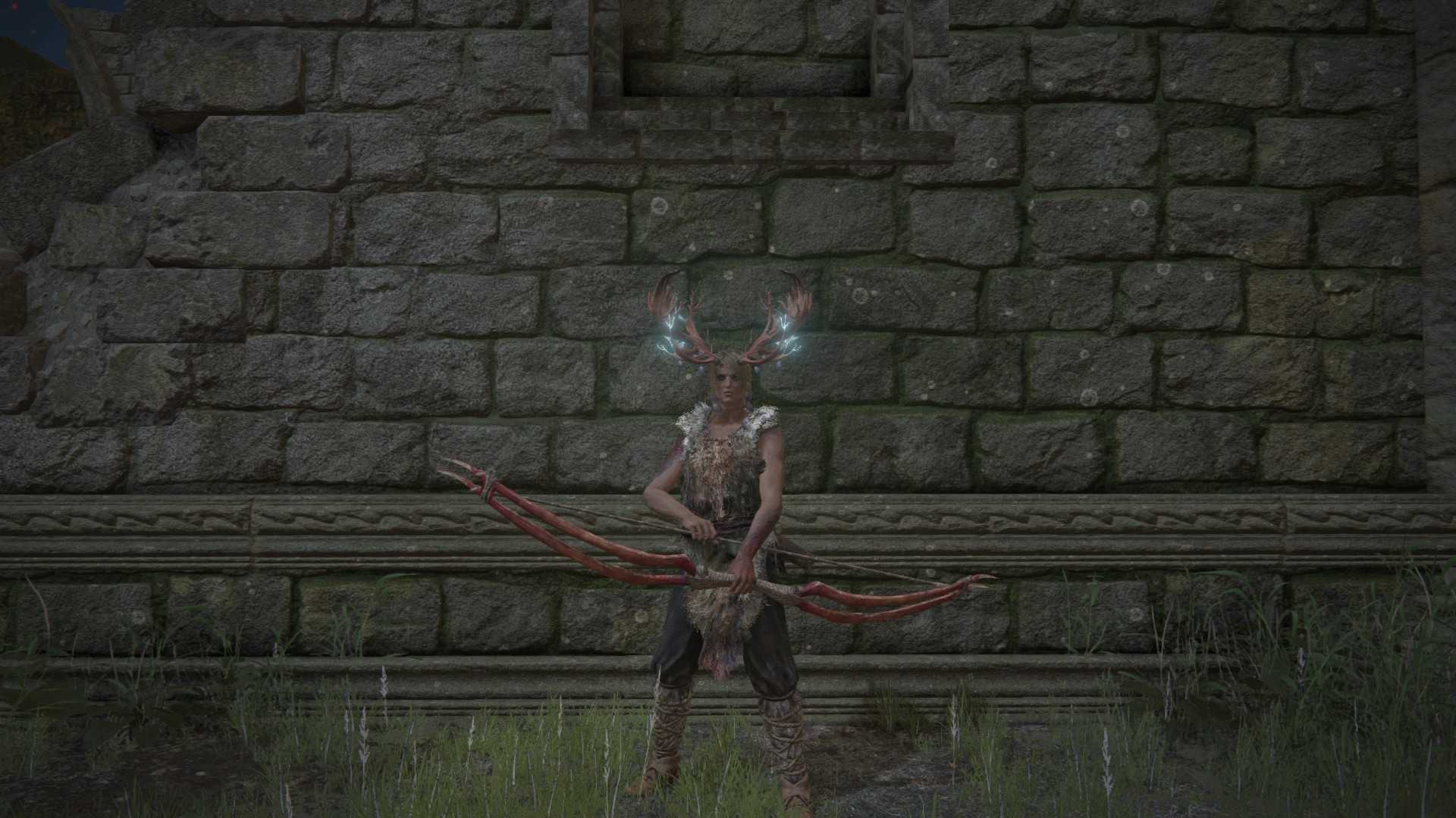 Для вашего варианта ближнего боя я рекомендую копье или пику, чтобы вы могли сохранять дистанцию. В терминах или доспехах подойдет что-нибудь легкое, но для этого охотничьего чувства я выбрал Повязка с сияющими рогами и Меховое одежда, которое вы получаете от Воинов предков в реке Сиофра.