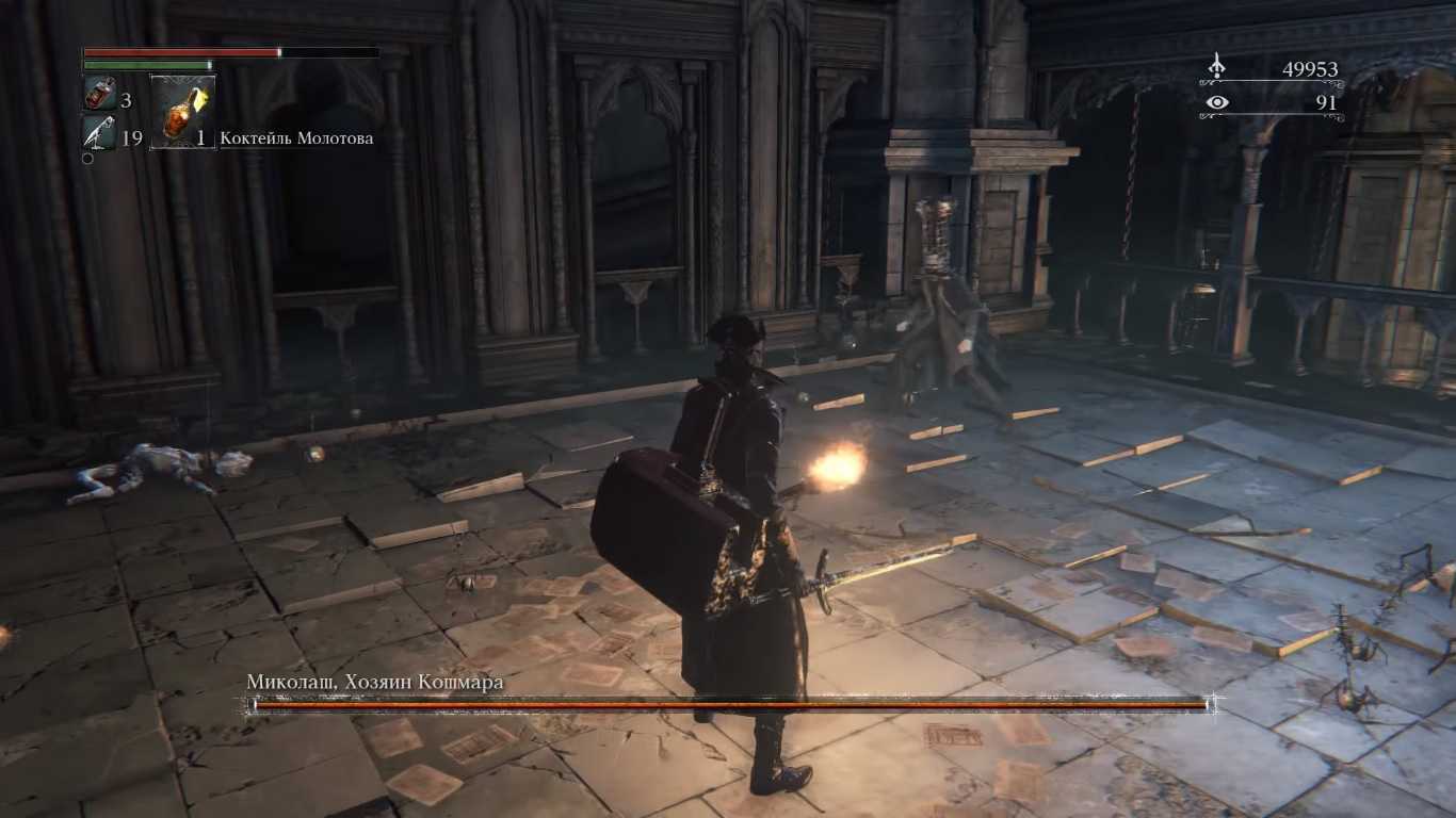 Поначалу вы будете регулярно находить лечебные снадобья, бутылки с коктейлем Молотова и горшочки с маслом, но эта халява закончится, как только вы покинете первую локацию. Если с медикаментами все ясно, то коктейли и масло вы получаете конкретно для битвы с церковным чудовищем. Запомните: в Bloodborne много обросших шерстью противников, в том числе и боссов — а все шерстяное отлично горит.