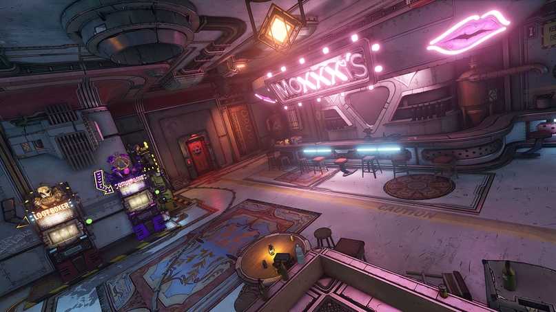 После тяжелого дня, проведенного в бою, стоит заглянуть в бар Мокси – там найдется все, чтобы поднять боевой дух. Этот бар/ночной клуб/казино управляется Мокси, которая с радостью развлекает гостей флиртом и бесконечными намеками. Если же есть настроение для азартных игр, можно попытать счастья у игровых автоматов: Трофейный бокс, Денежная ловушка и Загоны гонщика. Если повезет, можно разжиться неплохими наградами. В то же время, чтобы сыграть в Линию Хранилища, потребуется ценный эридий. Впрочем, потенциальная награда стоит риска.