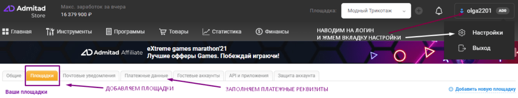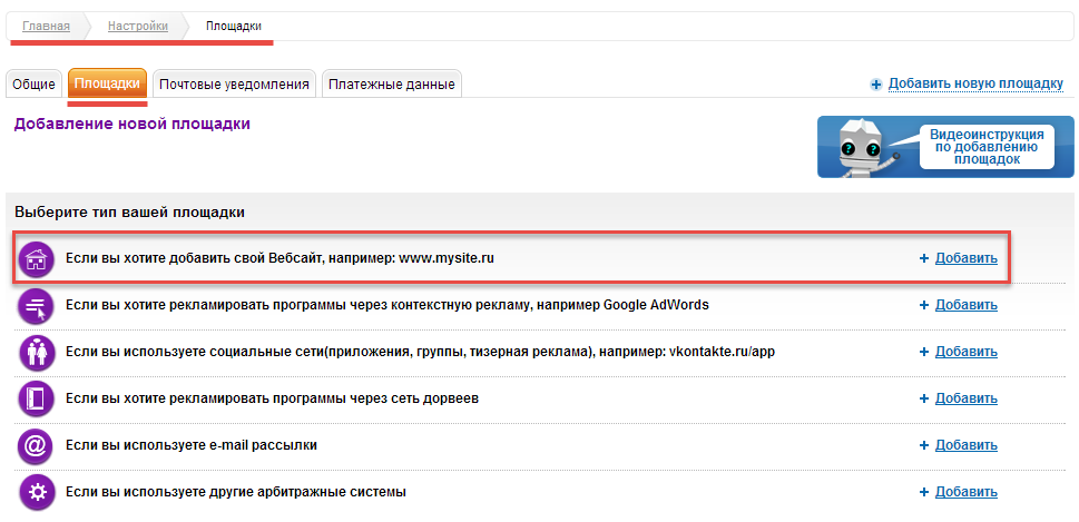 Для добавления площадки, наведите курсор мыши на свой логин и нажмите на вкладку Настройки. Далее, раздел Площадки → Добавить новую площадку.