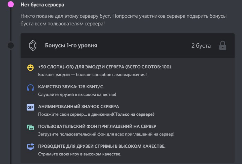 Если сервер поддерживается «усилением» двух подписчиков Discord Nitro одновременно, всем посетителям будут доступны следующие преимущества: