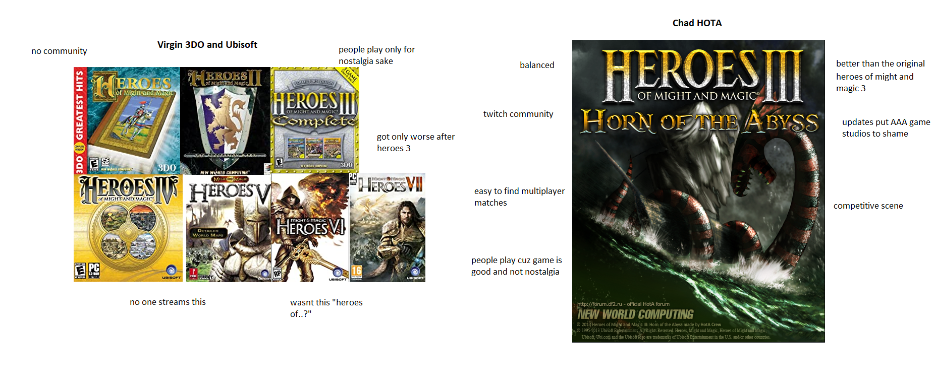 Активная стример-сцена. Во время COVID пиковый онлайн у самых популярных стримеров в Героях измерялся десятками тысяч (sic!). Для такой «забытой» игры по сути с нулевой поддержкой крупного финансового капитала — это огонь;