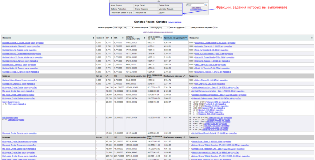 В данном случае мы рассматриваем таблицу с выводом LP у Guristas Pirates. Вроде бы по таблице все понятно — выбираем то, что приносит больше выхлопа при перерасчете на isk