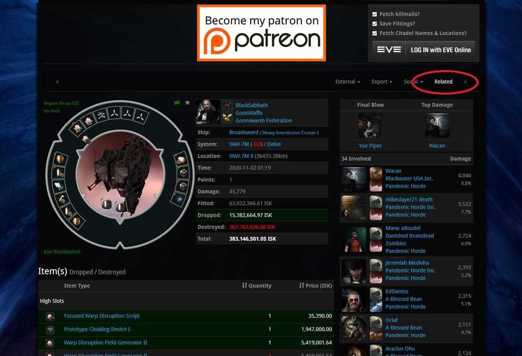 Другой момент, который необходимо знать для пользования киллбордой, это просмотр статистики сражения. В Eve Online редко бывают битвы 1 на 1, обычно в бою участвуют два флота, так что просматривая лишь данные об одном убитом корабле, вы не восстановите полную картину боя. Чтобы понять, что именно здесь произошло, используйте кнопку Related. Киллборда покажет вам все корабли, вовлечённые в этот бой, и полную статистику по потерям сторон.