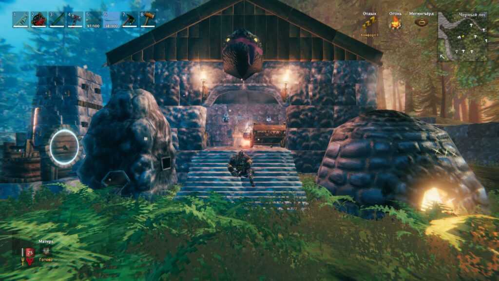 В постройках черный металл не участвует. Он необходим только для того, чтобы крафтить себе оружие и снаряжение. Данный металл участвует в таких крафтах, как алебарда, топорик. Это самая полезная вещь, которая делается из черного металла, ради чего стоит его фармить. С топором вы точно будете чувствовать себя гораздо комфортнее.