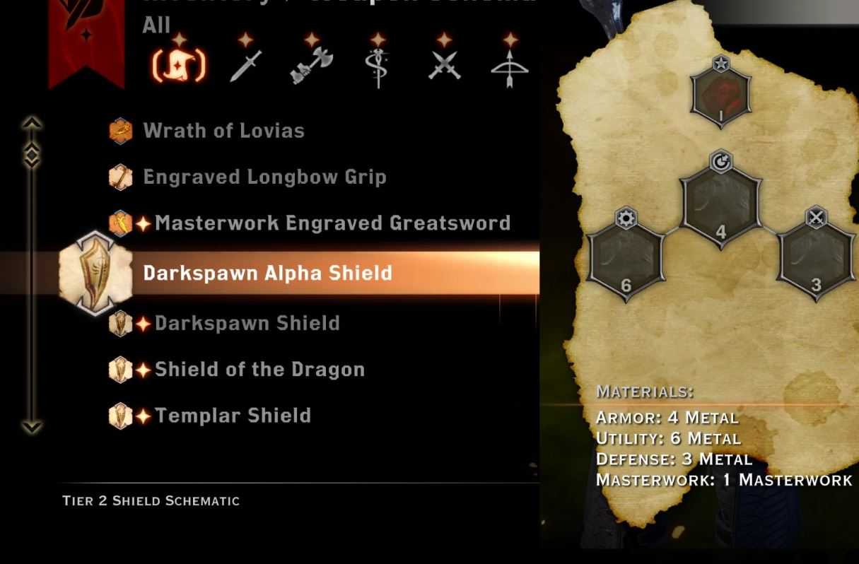 шедеврСхемы оружия и доспехов более высокого уровня могут иметь слот мастерской работы, который при желании можно заполнить мастерским ремесленным материалом, который может предложить уникальный бонус.