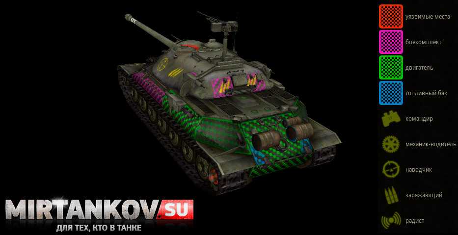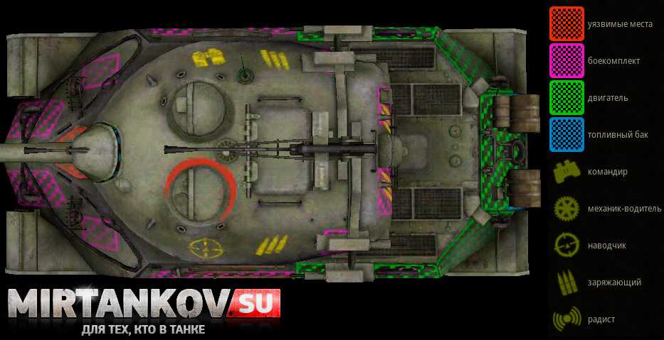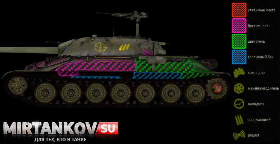 Теперь переходим к слабо защищенным зонам танка. Знать эти места надо: во первых, если вы катаетесь на семерке, чтобы не подставляться, во вторых, если вы хотите результативнее вести огонь по ИС-7 и уничтожать наносить урон эффективнее.