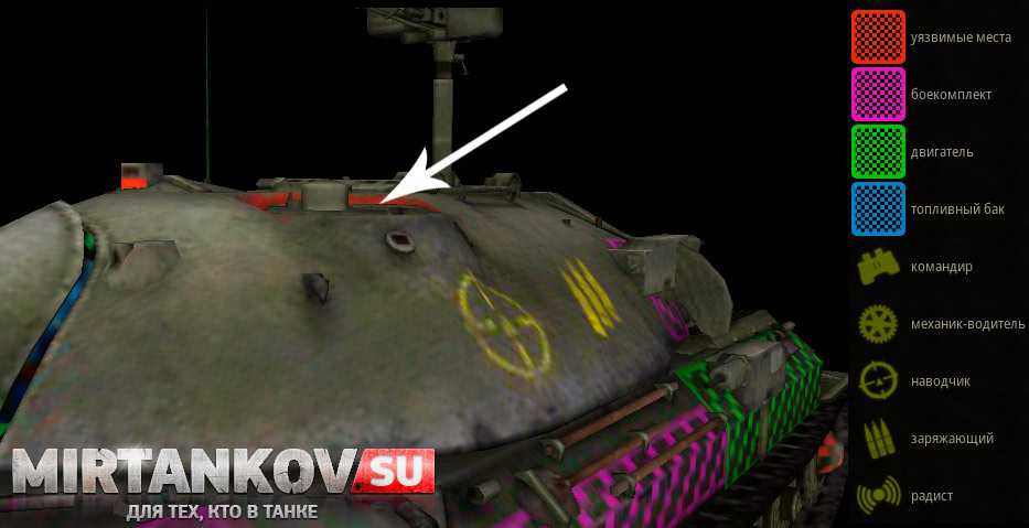 Казалось бы уязвимое место выделено, можно стрелять! Но не тут-то было. Люк находится в углублении и когда танк стоит ровно на земле без перекосов, то попасть туда сможет лишь Майкл Джордан: