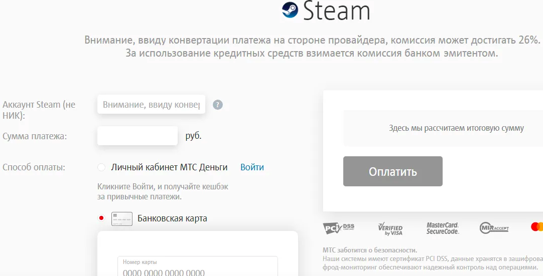 - Пополните счет банковским переводом или со счета мобильного телефона. Введите имя аккаунта вашего Стима и сумму платежа.