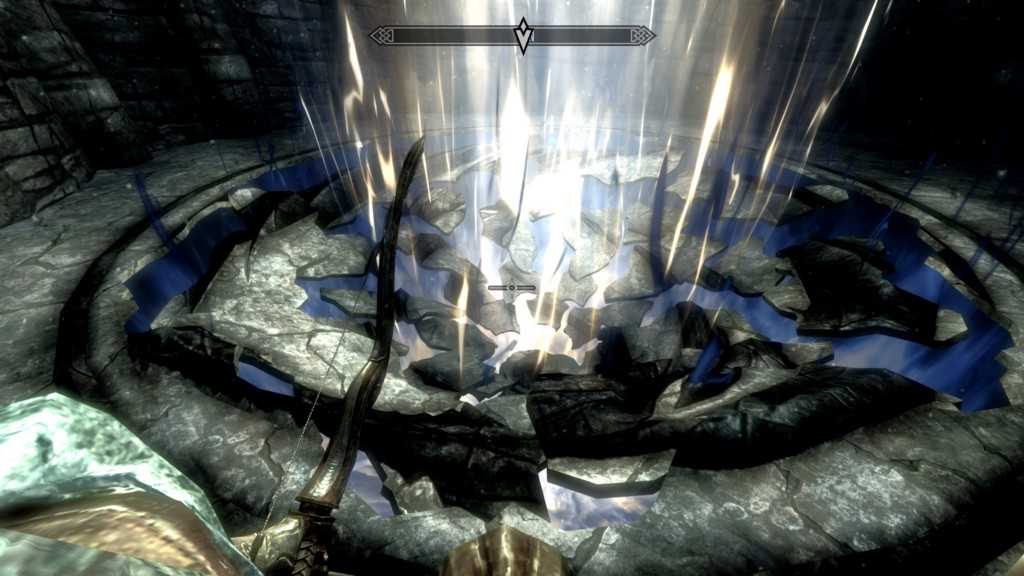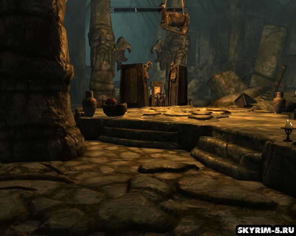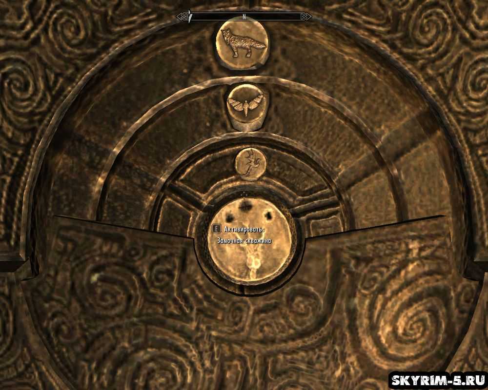 У Скулдафна вас тепло поприветствуют сильные драугры и драконы. Портал находится снаружи храма, но, чтобы добраться туда, придется заглянуть внутрь. Там тоже хватает драугров. Есть и несложные головоломки. Первая открывает две двери. Если смотреть на колонны со стороны рычага, то правая дверь открывается комбинацией «птица, птица, птица», а левая — «птица, змея, птица».