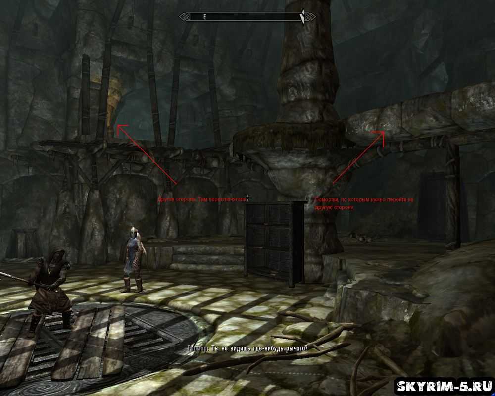На мой взгляд, этот имперец умственно отсталый. Нет, ну сами подумайте – какой человек в здравом уме встанет на легко воспламеняющееся масло под кувшином с чем-то горящим? Ну, ему же хуже. Либо скидываем выстелом из лука или заклинанием, либо идем в ближний бой. Кроме него в комнате еще 4 стражника. Как только мы нападаем на них — прибегает Галмар и компания. Имперцы благополучно отправляются в ад, а мы отправляемся на следующий уровень захоронения. И практически в самом начале уровня нам встретится дверь, для открытия которой нужен коготь, валяющийся рядом. Головоломка детская, но вот ответ.