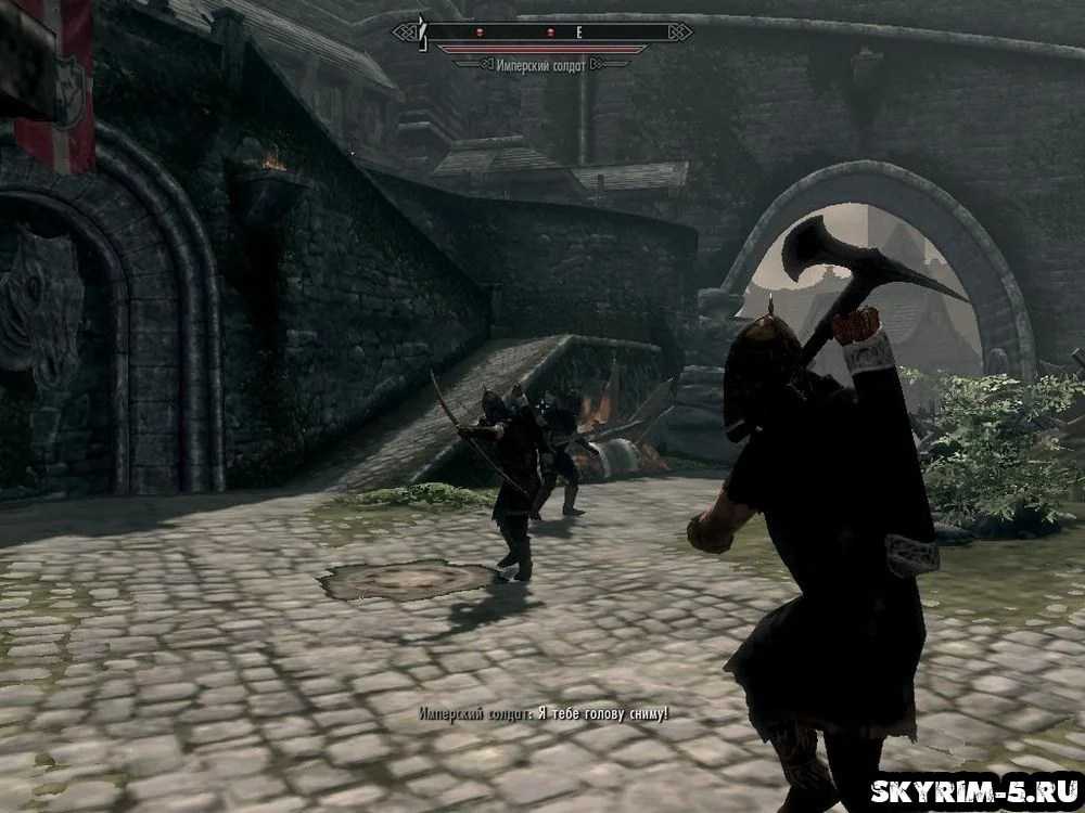 Ждём её окончания и входим в Солитьюд. Прорываемся к мрачному замку, убивая на пути всех Имперцев. В начале могут возникнуть трудности, так как можно перепутать дороги. Если подняться по подъёму почти в самом начале, то наткнётесь на решетку, которую никак не открыть. Нужно не к ней подниматься, а идти дальше. Там будет проход во двор.