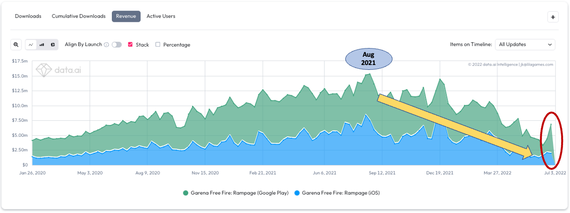 Since August of 2021, Free Fire has been on a steady decline. Based on data.ai (an analytics and data provider) estimates we can see that revenue has fallen from peak (in August 2021) to trough (June 2022) by over 78%: