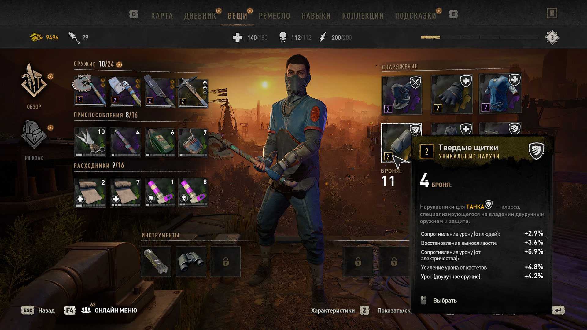 Количество слотов под модули тоже зависит от цвета. Также можно накрафтить себе всякие гранаты, «коктейли Молотова» и УФ-лампы, которые отпугивают заражённых. Когда получите лук или арбалет, обязательно создайте себе отбрасывающие стрелы — скидывать бандитов с крыши такими одно удовольствие, да и в принципе весело, когда ваши враги отлетают как тряпичные куклы.