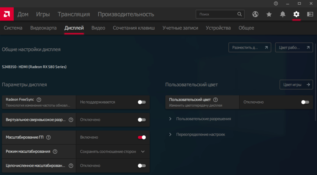 Для его включения достаточно в окне AMD Radeon Settings перейти в раздел Дисплей. Теперь перетянуть ползунок Масштабирование ГП в положение Включено.
