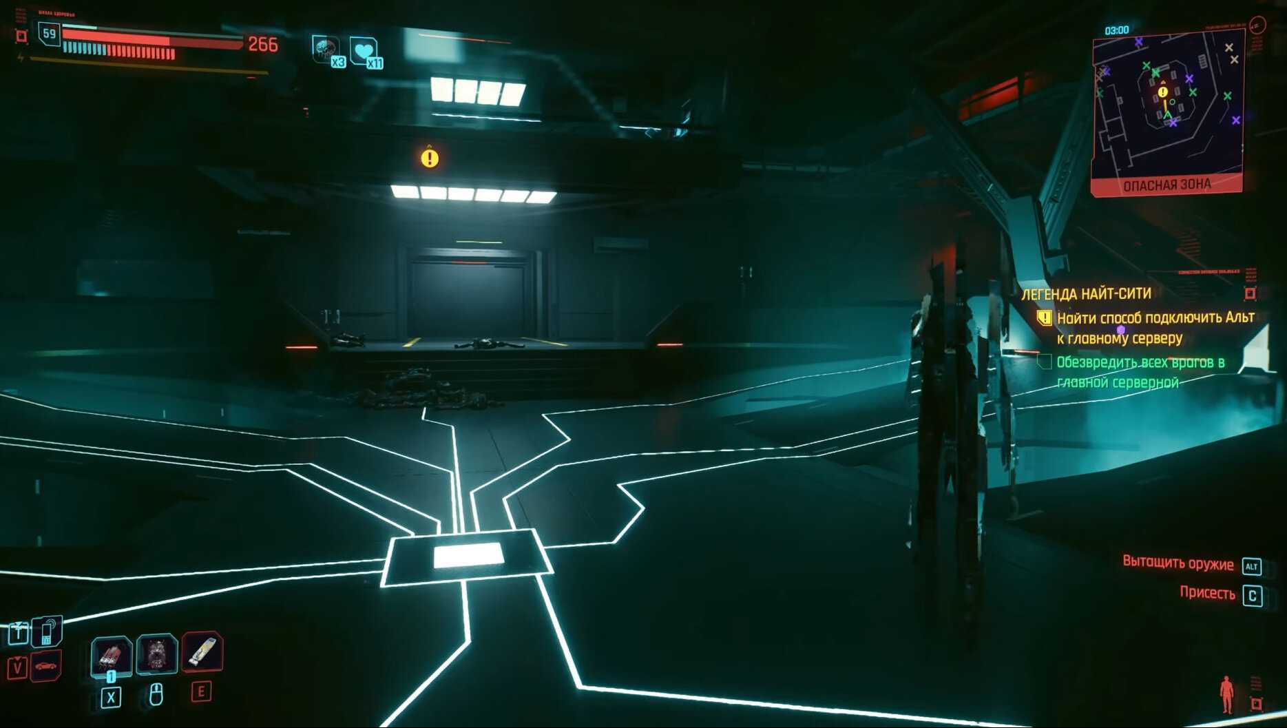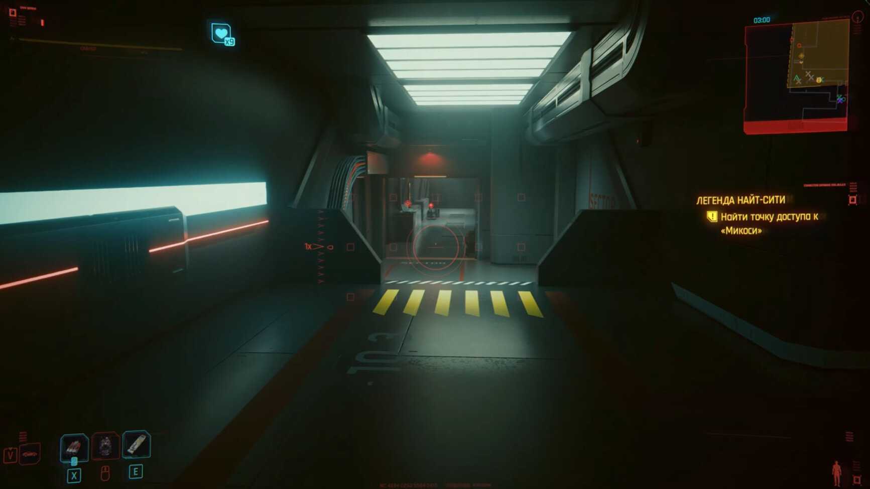 Выйдя из лифта, Ви должен пройти через несколько коридоров, полных врагов, чтобы добраться до терминала, где они смогут подключить Альт. За первым поворотом находится боковая дверь в комнату охраны. Следите за ней, так как солдаты будут использовать ее для обхода V с фланга.