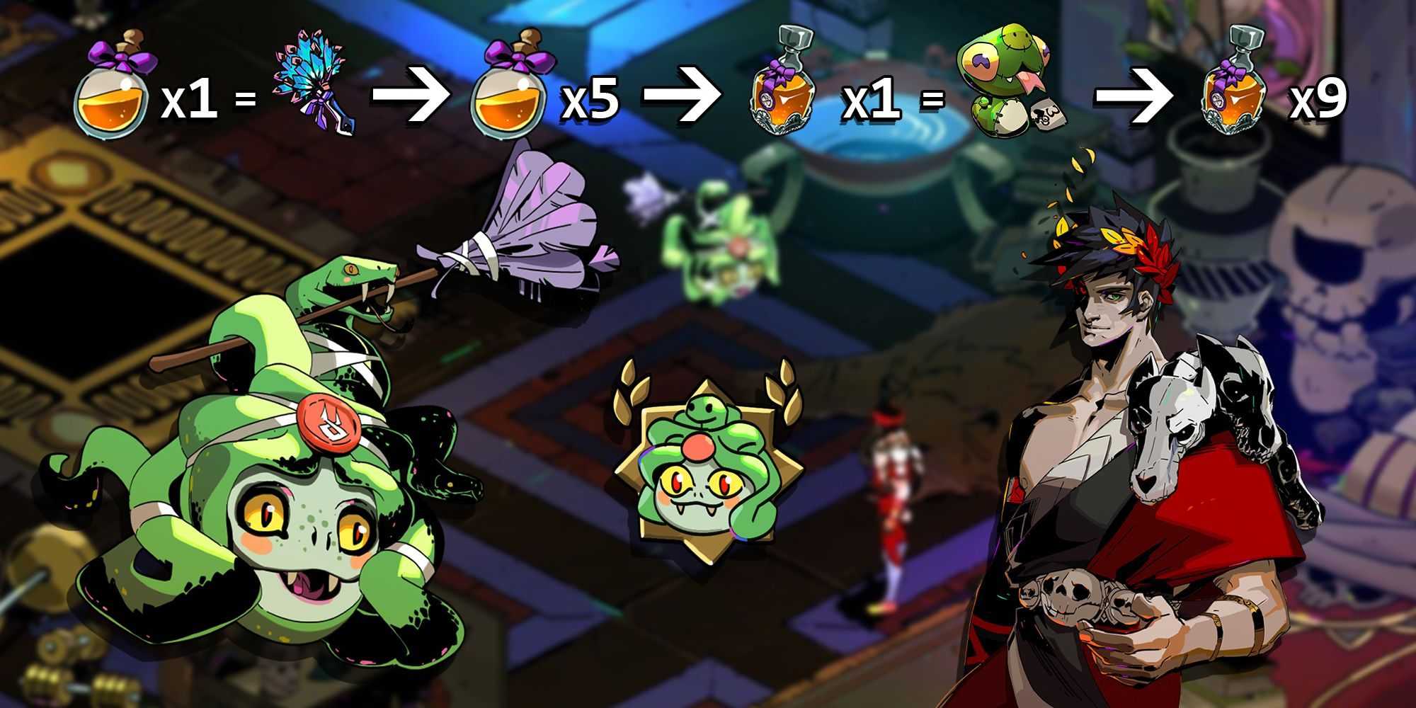 Фиолетовая капляПосле победы выпадет несколько сфер, которые используются для повышения разных параметров и умений персонажа в зеркале ночи.КлючВыпадает ключ. Ключи нужны как для разблокировки оружия, так и для разблокировки новых умений и навыков в зеркале ночи.Драгоценные камниВыпадают цветные камни, используемые для покупки предметов декора и улучшения хаба игры (House of Hades).Желтая склянкаПодарок, который вы можете передать любому персонажу. За это в стеклянному шкафу около оружия в хабе разблокируется новый сувенир. Вы сможете выбрать один из сувениров, который будет предоставлять бонус при каждом новом прохождении игры. К примеру, очень полезен сувенир, восстанавливающий ХП на 50% от количества подобранных капель тьмы (фиолетовые капли).МолотПозволяет каким-то образом усилить оружие.Золотая монетаПозволяет заработать монеты. При каждом новом прохождении количество монет сбрасывается, а расходуете вы их только в текущем забеге. Потратить монеты можно у торговца или в магазине при взаимодействии с чашей фиолетовой жидкости (прямо на некоторых уровнях, после победы над монстрами, или при переходе на новый уровень).МешокПозволяет встретить торговца.Сердце с красным трезубцемПовышает максимальный запас ХП на 25 единиц.ГранатПовышает уровень одного из доступных вам умений божеств.Круглый камень с тремя цветными алмазами и восклицательным знакомПоявляется либо при переходе с одной главы на другую (после победы над боссом), либо во время прохождения главы. Во втором случае ведет в комнату с Сисифусом, который даст вам ХП, сферы тьмы или золотые монеты.