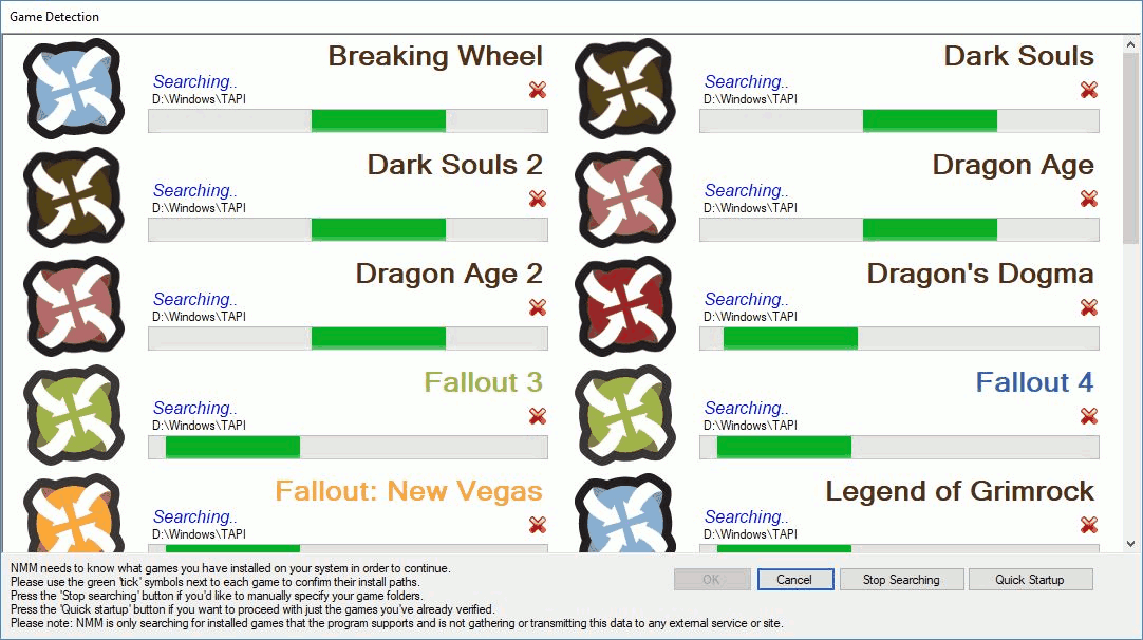 Nexus Mod Manager ищет более десятка различных игр. Как только он обнаружит Skyrim, вы можете нажать Прекратить поиск если у вас нет других игр.