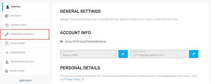 We’ve created a step-by-step guide for each option to make your account more secure. For safety reasons, we can’t show you a detailed image of everything, but it’s easy once you access the right page. Regardless of which option you choose, there are two steps you need to complete first. First, you need to log in to your account on Epic Games; then, you need to select Password and Security on the left. The image below shows the locations of both of these items.