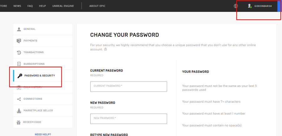 Первое решение для запуска состоит в том, чтобы настроить один Надежный пароль. В этом смысле, чтобы изменить его, войдите в свою учетную запись Эпические игры и я пошел в раздел Учетная запись > Пароль и безопасность.