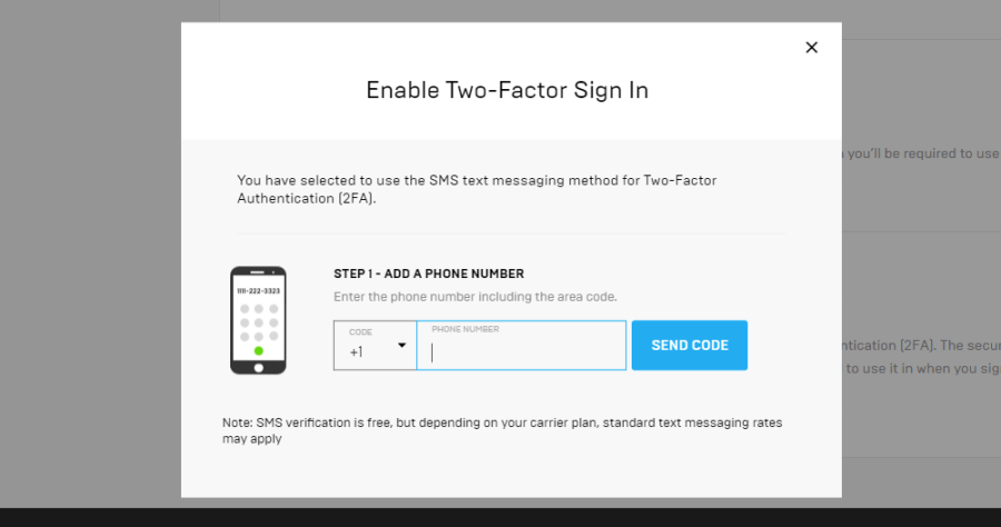 - If you enable “Epic Game 2FA SMS Authentication,” Enter your phone number and country code and click “Send code.”