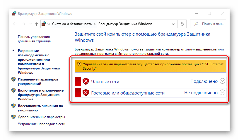 Обычно антивирусы автоматически берут на себя управление параметрами брандмауэра Защитника Windows. В таком состоянии он не может контролировать входящий и исходящий трафик.