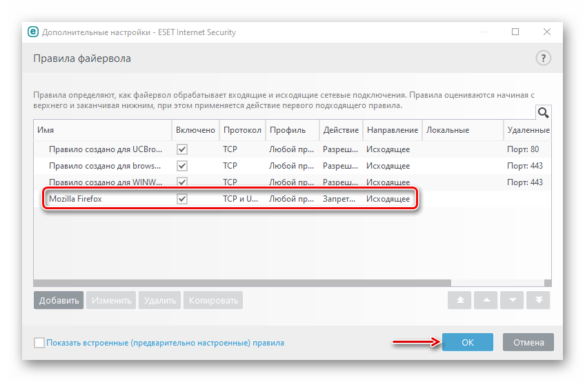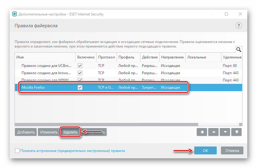 Чтобы снять запрет, снова открываем список правил, выбираем теперь уже ненужное приложение, жмем «Удалить», а затем «ОК».