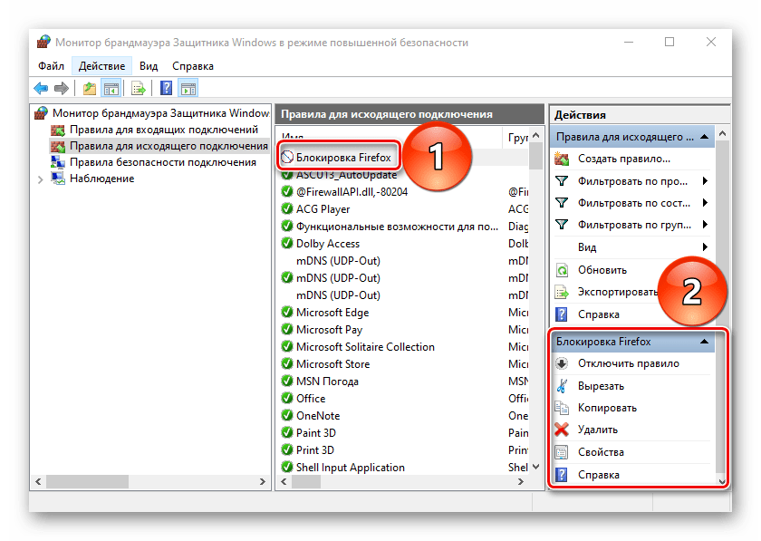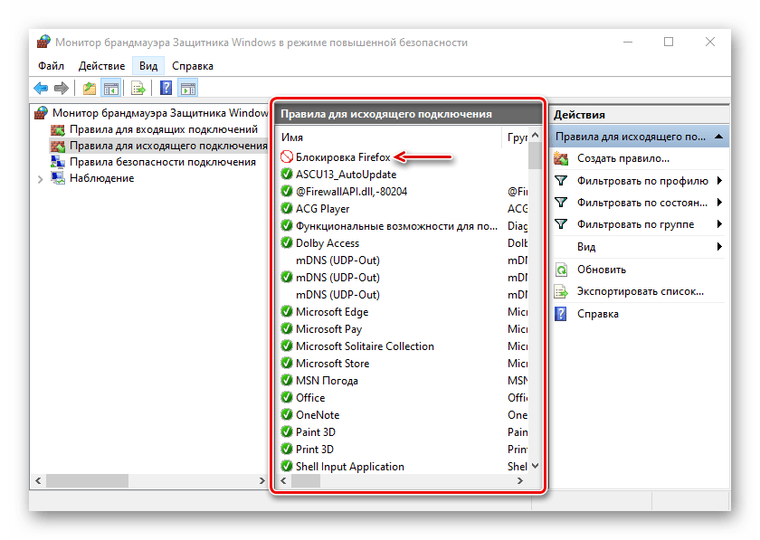 Проверяем, что новое правило появилось в списке для исходящего подключения. С этого момента выбранное приложение не будет подключаться к сети.