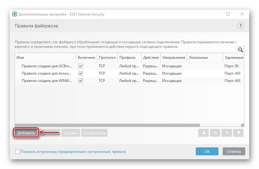 - Открывается окошко со списком правил, кликайте «Добавить»;