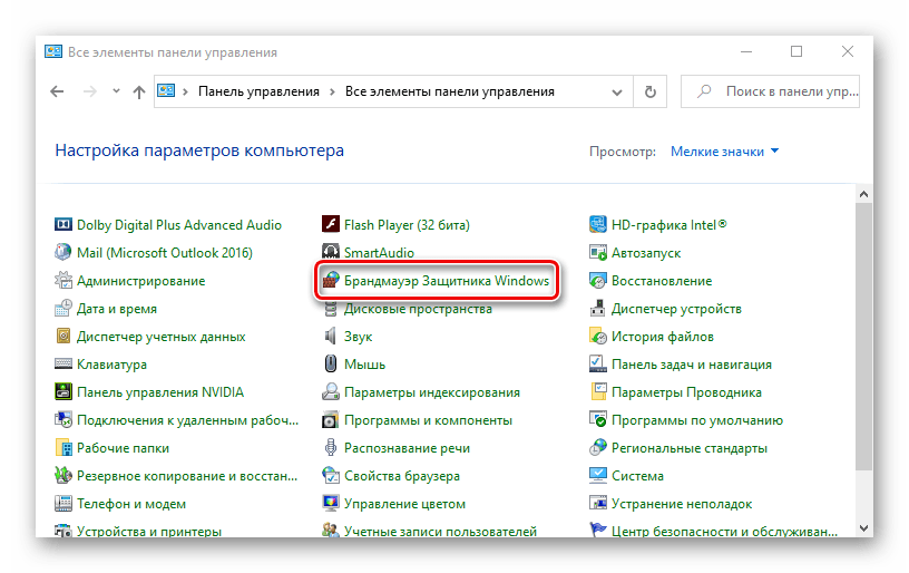 - На панели управления просто нажмите на опцию «Брандмауэр Защитника Windows».