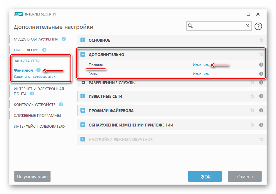 Во вкладке «Защита сети» открываем раздел «Файервол» и в блоке «Дополнительно» напротив пункта «Правила» нажимаем «Изменить».