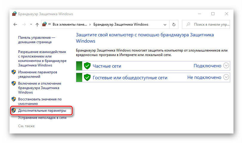 Откройте настройки брандмауэра (Панель управления / Система и безопасность / Брандмауэр Windows) и выберите пункт “Дополнительные параметры”: