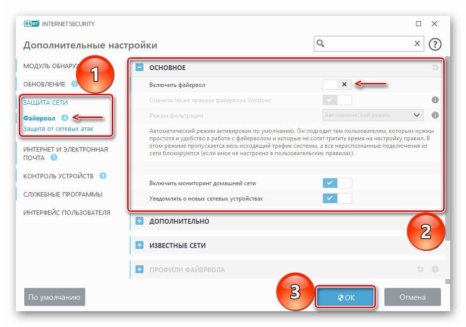Правила, созданные в нем или с помощью специального софта, работать не будут. Чтобы передать управление брандмауэру Виндовс, необходимо отключить файервол антивируса. Снова открываем «Дополнительные настройки» ESET Internet Security, во вкладке «Защита сети» переходим в раздел «Файервол» и в блоке «Основное» отключаем его. Нажимаем «OK», чтобы сохранить изменения. Если ситуация не изменится, перезагружаем компьютер.