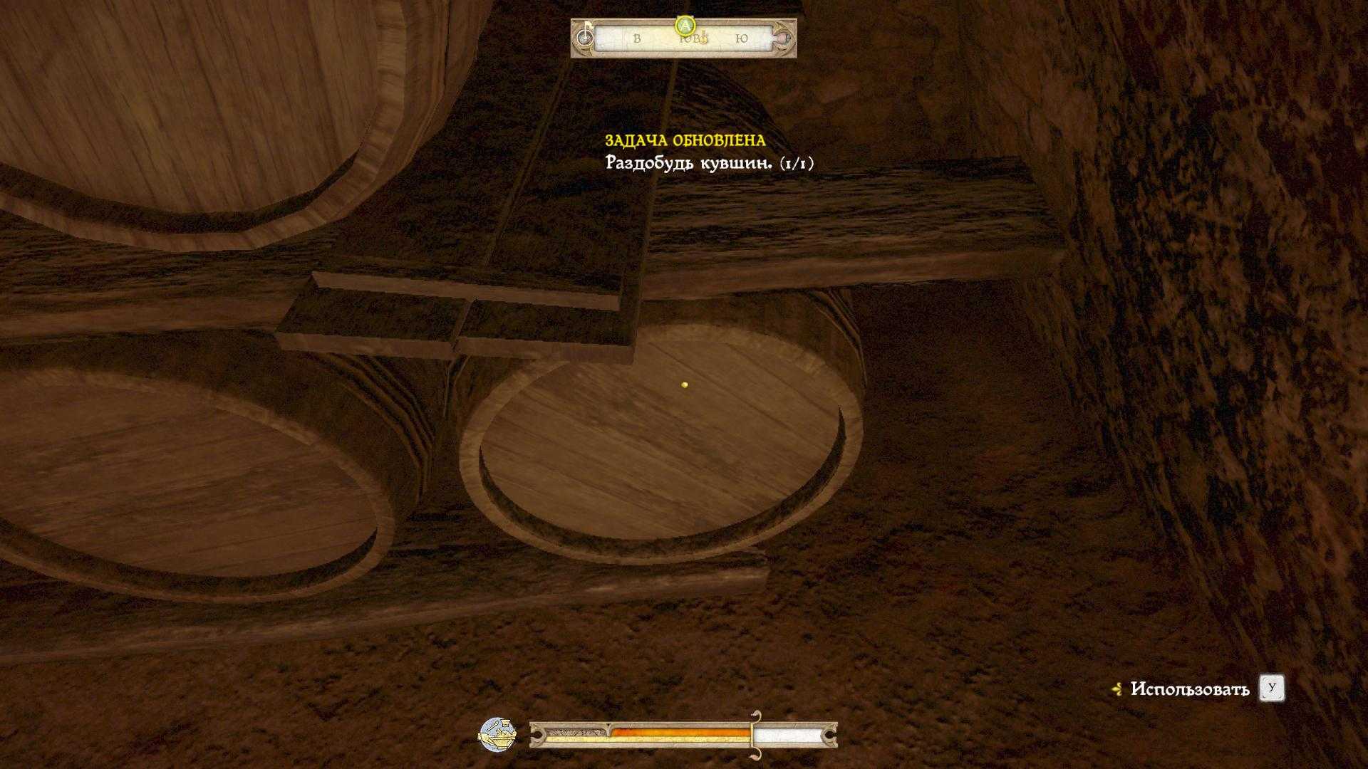 Пройдите во вторую комнату и откройте дверь слева, за которой наверняка будет охранник. Пройдите мимо него, быстренько спуститесь в подвал. Если он вас остановит, то скажите, что пришли за вином. Выберите фразу, связанную с красноречием. Спуститесь вниз, возьмите кувшин для вина и заполните его пойлом из правой нижней бочке в конце погреба. Возвращайтесь обратно в купальни и отдайте Птачеку вино. Согласитесь выпить.
