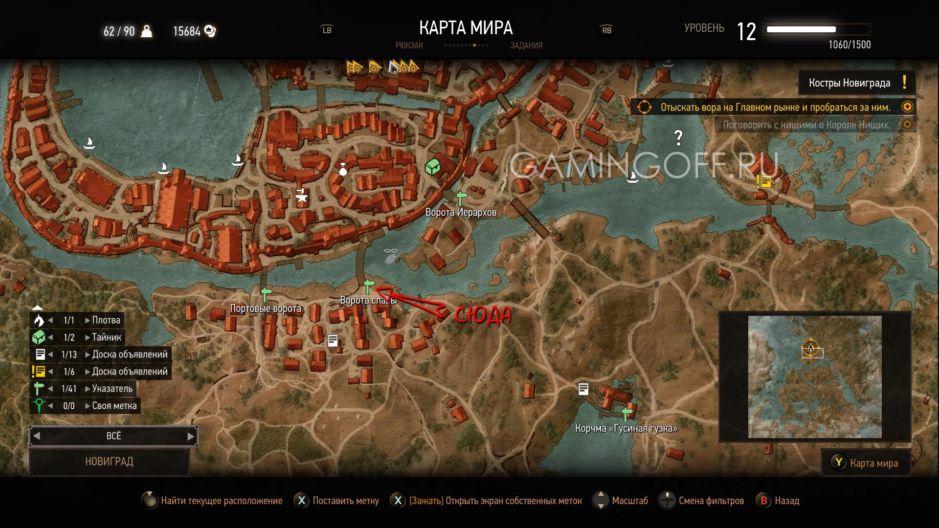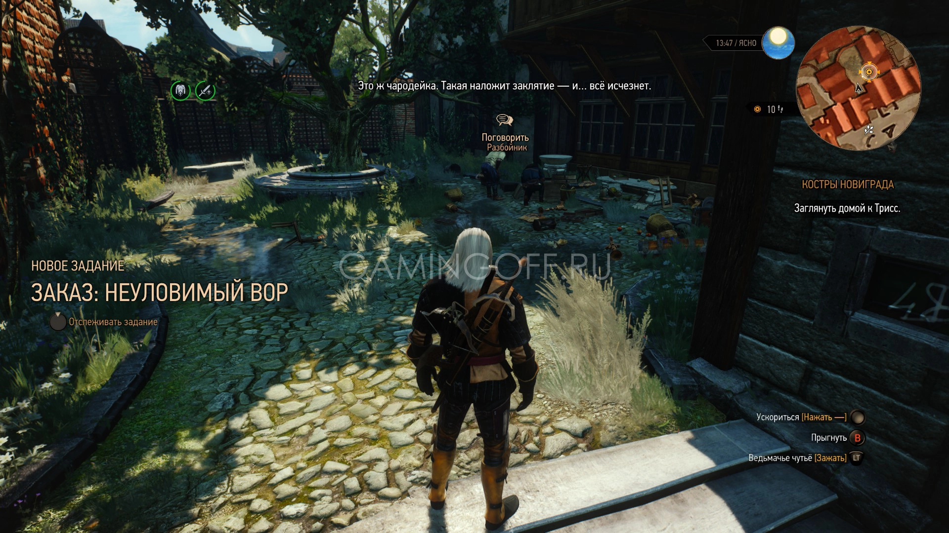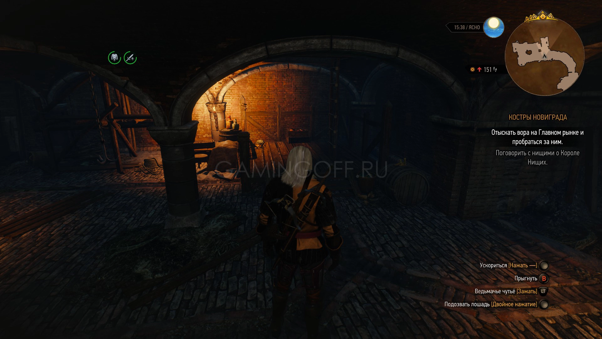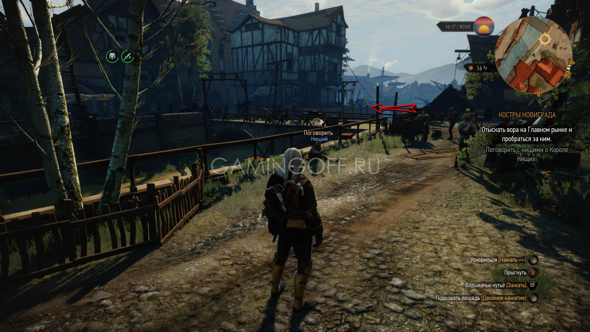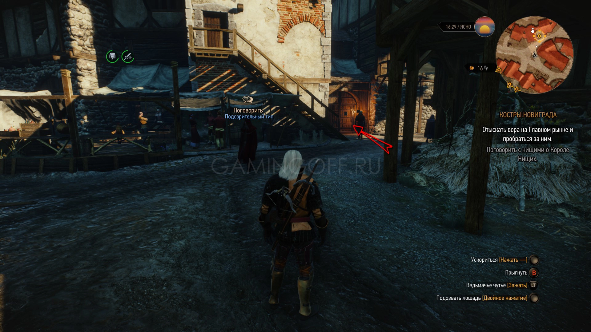 Отправляйтесь в Новиград. Вам так или иначе придется пройти через Рынок на площади Иерархов, на которой будут сжигать чародейку по имени Фелиция Кори и краснолюда Ляшареля. После просмотра кат-сцена, сворачивайте в переулок, пройдя через ворота, вы встретите двух воров, копающихся в раскиданных вещах. Во время диалога выберите «Давайте поговорим», после чего они дадут подсказки, но в ваш разговор вмешается Менге.