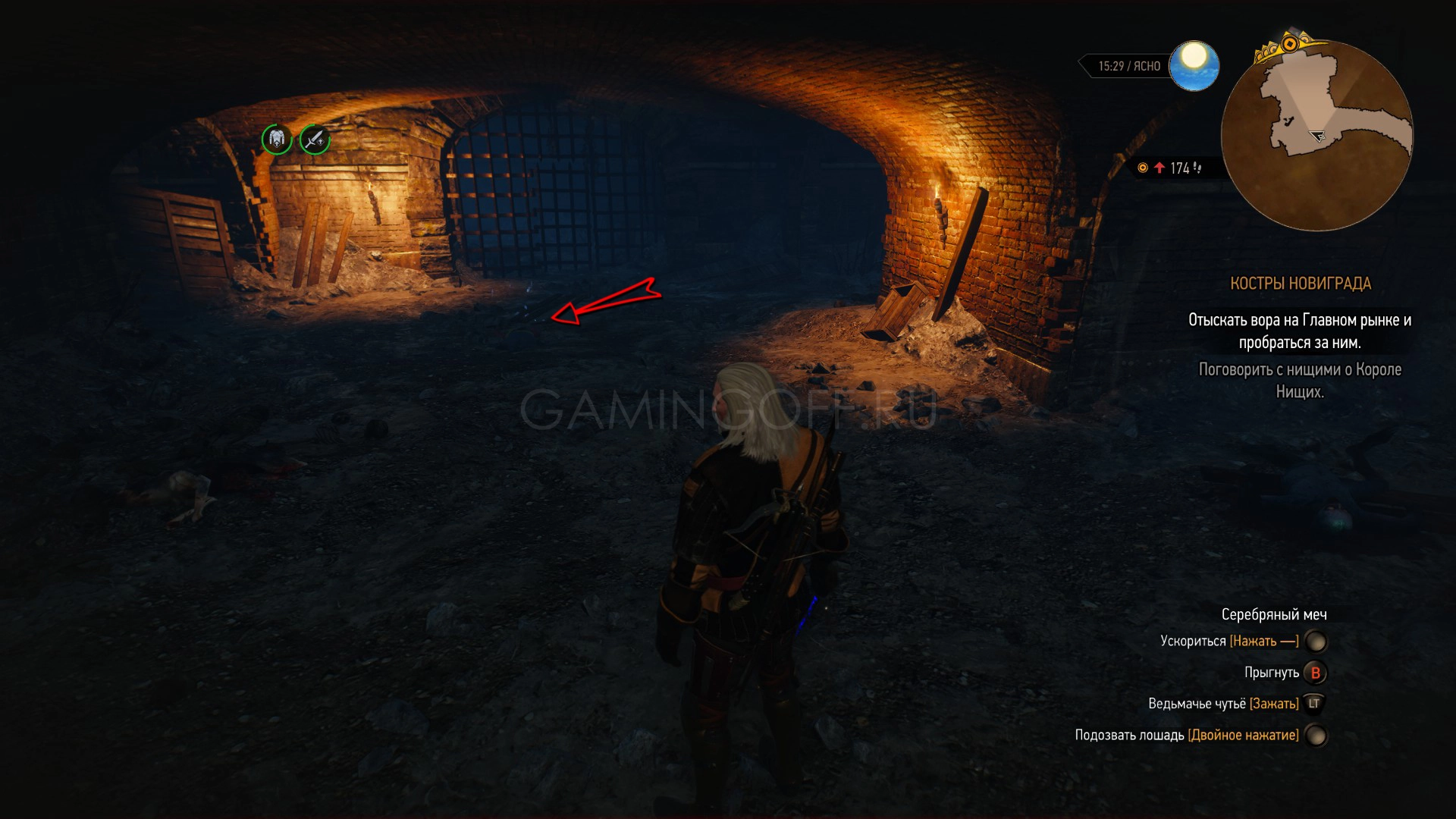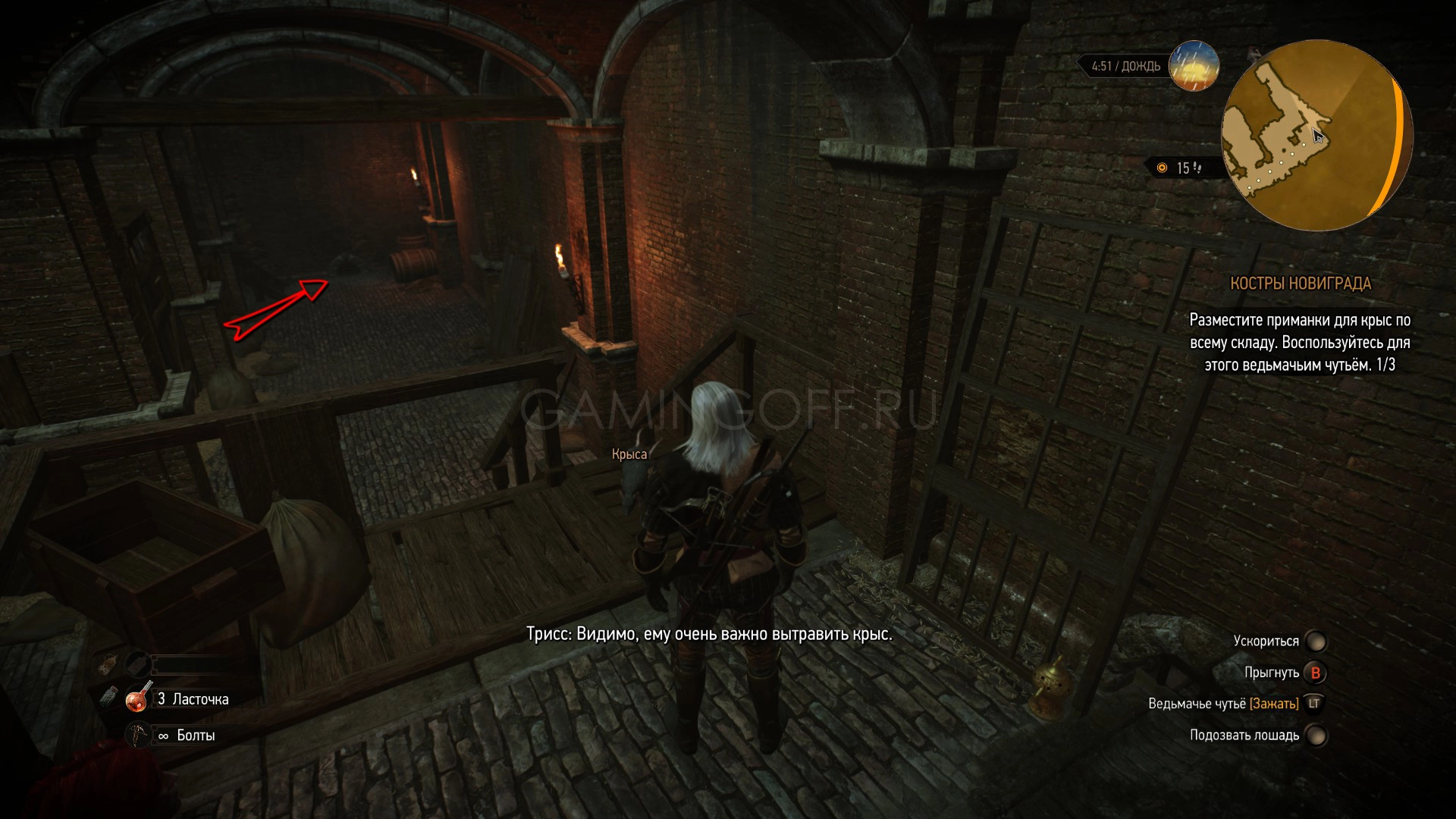 Следуйте за Меригольд. Дойдя до «торговца» выберите вариант ответа «Где ты выбросил мешок». Прежде чем спускаться подпол, сначала осмотрите все мешки, полки и сундуки в доме, а уже после открывайте подпол и спускайтесь вниз. Внизу вы найдете несколько сундуков и утопца. Трисс скажет о том, что тут где-то должен быть рычаг, он находится на колонне.