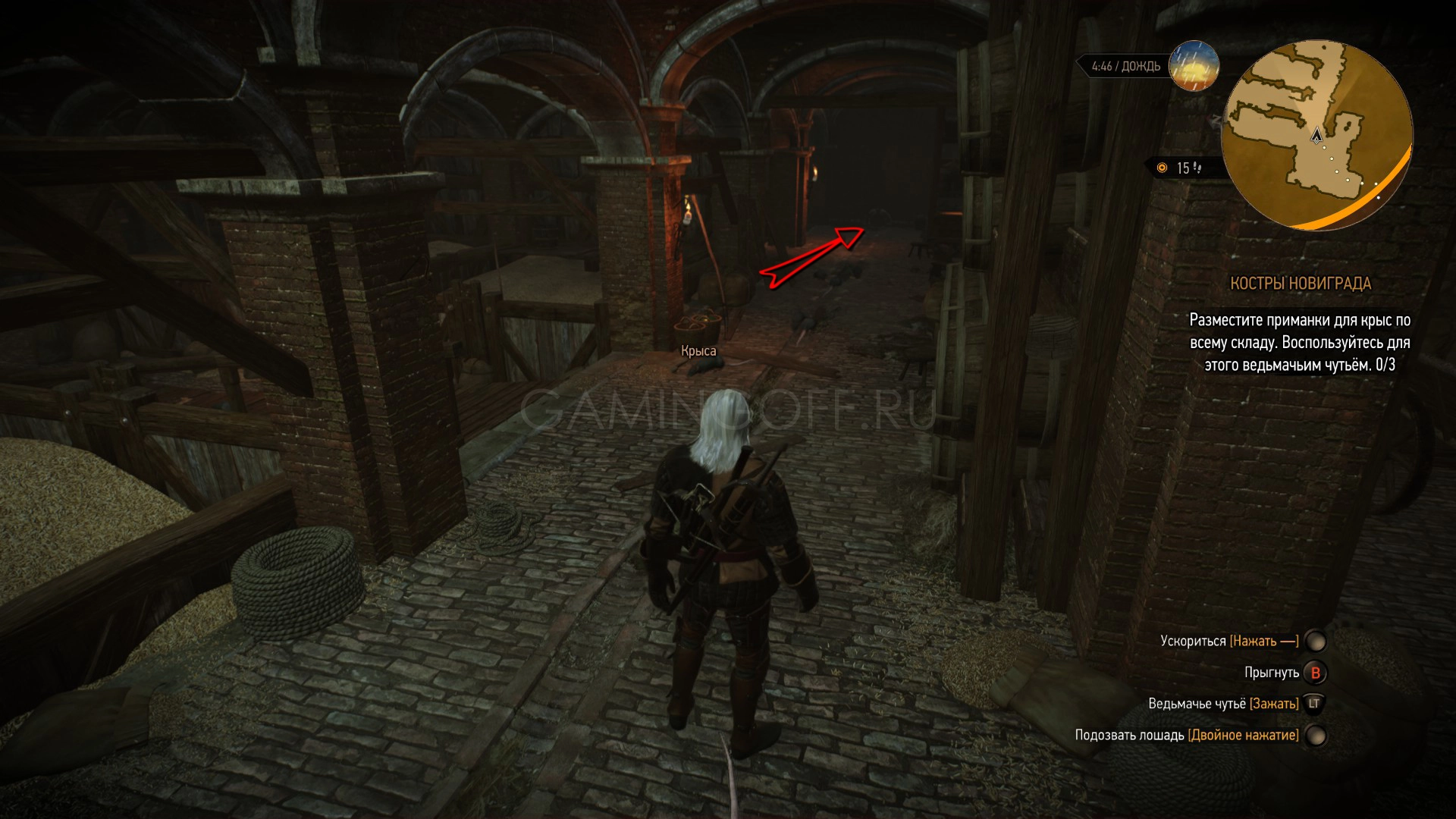 Выиграете Золу дважды, после чего побеседуйте с Птачеком. Можете забраться в ванную в одежде, но на этом ваш отдых будет закончен. В другом варианте подойдите к соседнему ящику и взаимодействуйте с ним, чтобы автоматически снять одежду и забраться в ванную. Ждите, пока Птачек заговорит о вине и попросит принести его. Отправляйтесь в Ратае и подойдите к ратуше. Здесь очень пригодится факел, поскольку путь в подвал темный. Идите слева от ратуши и найдите задний вход.