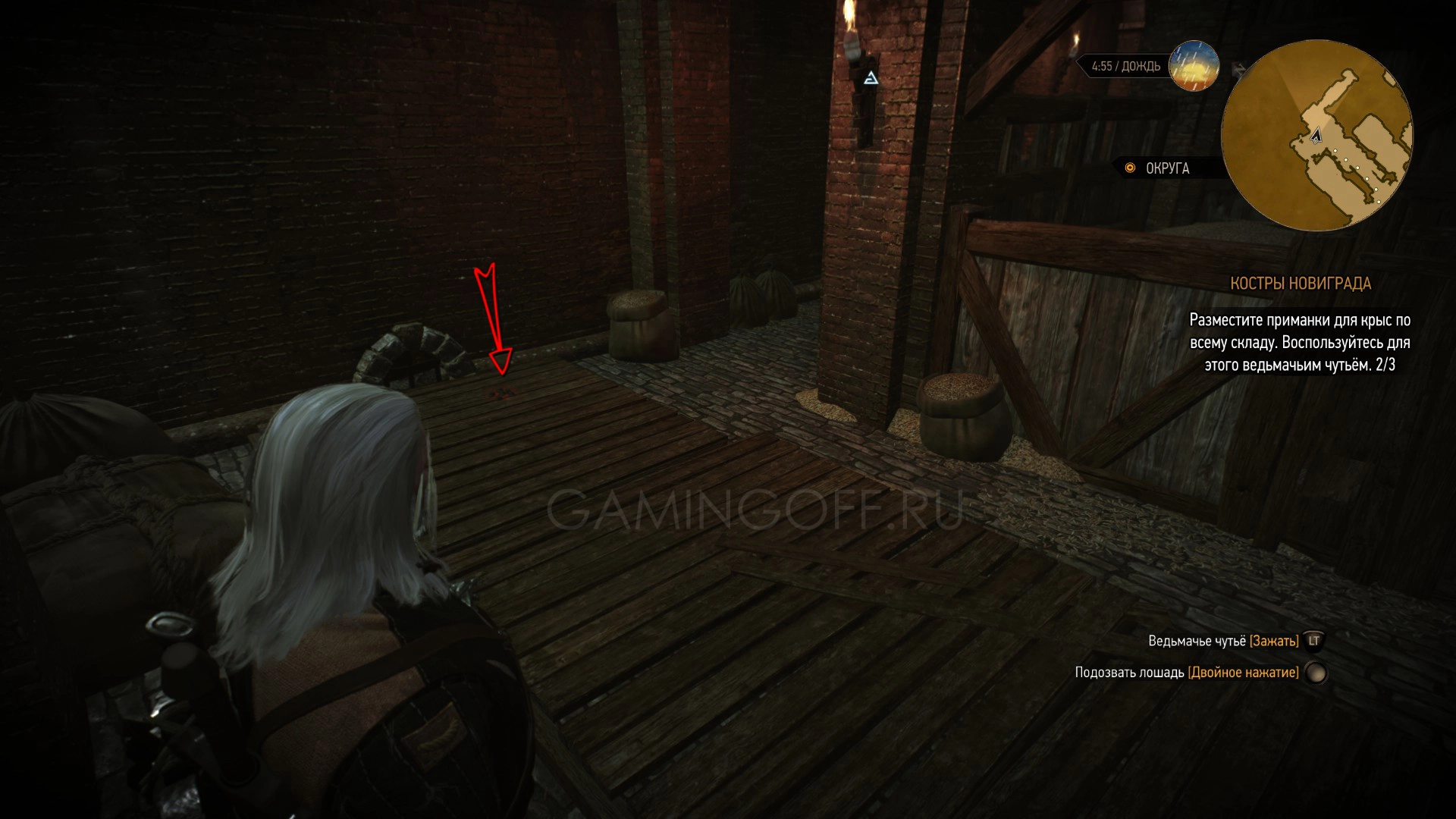 Заходите на склад вместе, затем бегите направо, ориентир — маленькая дыра в стене. Используйте чутье, чтобы установить приманку, далее идите налево к такой же дыре. Последняя дыра будет слева — поднимитесь по лестнице и пройдите немного вперед.