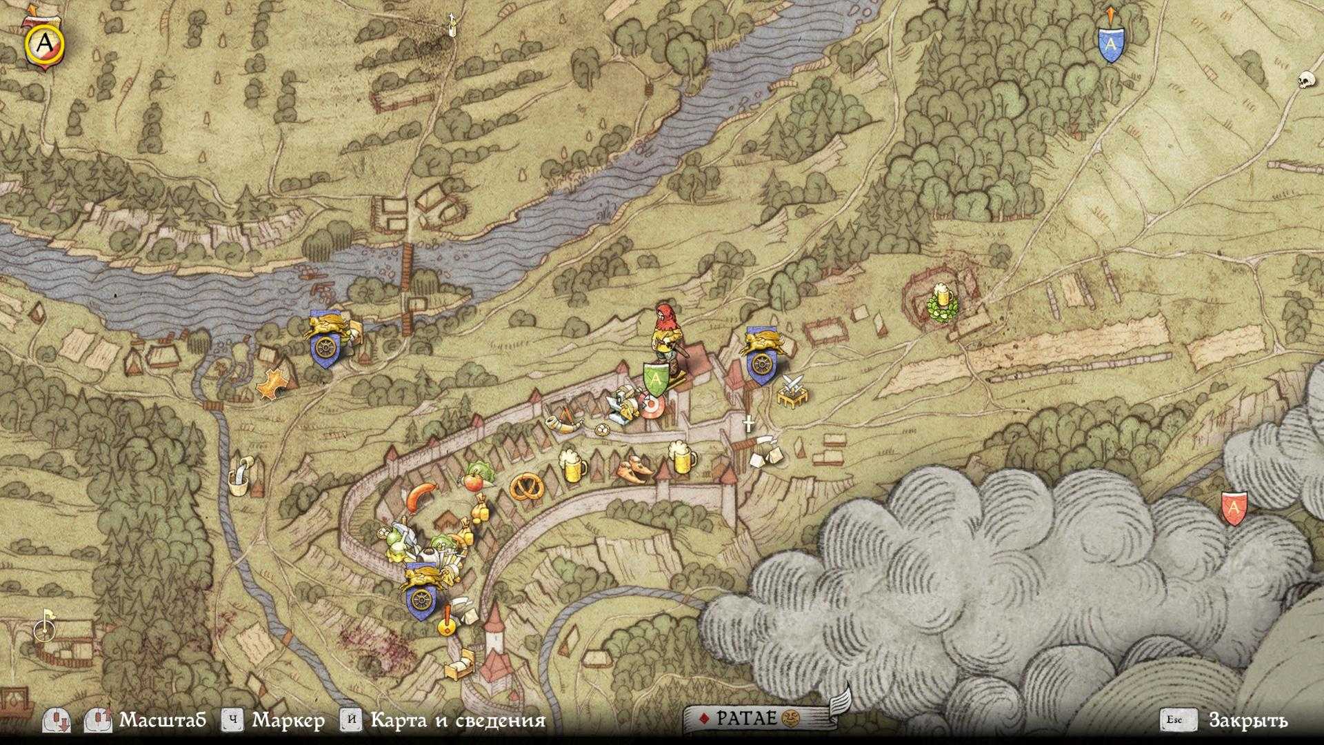 В гонке участвуют 4 лошади, причем белая лошадь чуть быстрее нашей, и если будем просто скакать по дорогам — то проиграем. Нам нужно посетить 3 контрольные точки в соседних деревнях, а потом вернуться в Тальмберг. Срезаем, и скачем напрямую по полям. За победу в гонке получим достижение «Рыцарь-наездник».