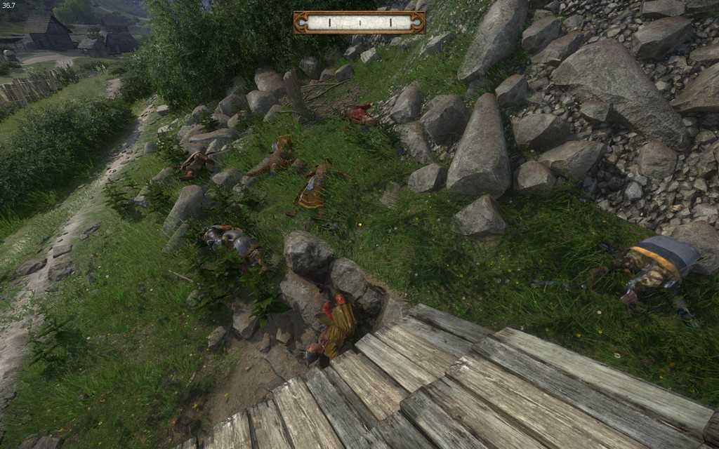 Половецкий лучник, начав натягивать тетиву одновременно с вами, отпустит ее на полсекунды-секунду раньше. Потому совет: если лучник один, лучше увернитесь, а до двух-трех стреляющих одновременно лучше вообще не доводить (вариант на крайний случай – спрятаться за коньком крыши). Стрейфимся на момент вражеского выстрела, это можно делать, натягивая свой лук, в таком случае половец наверняка промахнется. Деревянный навес это позволяет. Генри в половецком доспехе держит попадания стрел относительно неплохо, но злоупотреблять этим не стоит. Два лучника одновременно стреляющие в вас больше похожи на пулемет: хоть урон от каждой стрелы небольшой, но стамина почти не восстанавливается и натянуть свой лук вам не дадут, рано или поздно получите хедшот или кровотечение и тогда уже точно не вывезете.