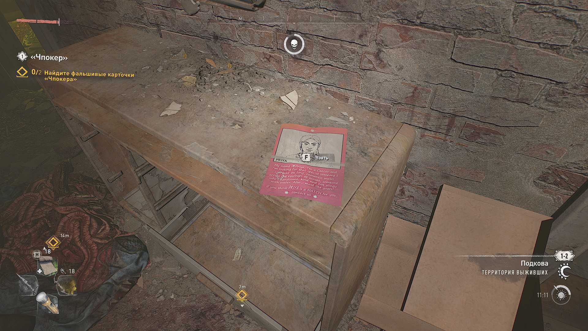 Осматриваем карту на стене позади Рахима и отправляемся к нужным маркерам. В темной зоне находим листовку на тумбочке, а в убежище бандитов — на круглом обеденном столе.