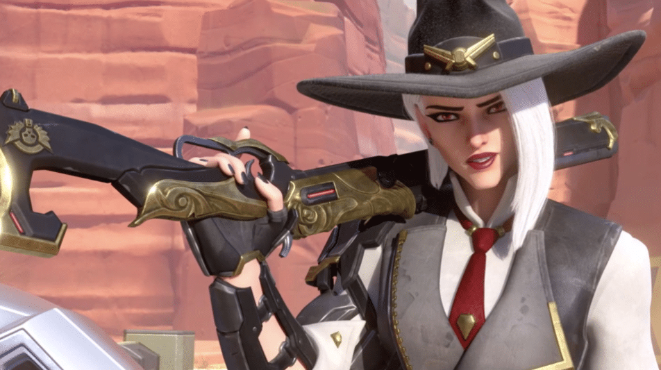 Ashe is a western-themed cowgirl; she has white hair above her shoulders, red eyes, and a beauty mark near her lips. Her primary weapon is a semi-automatic rifle that requires precise aim to use. Her primary role is damage.