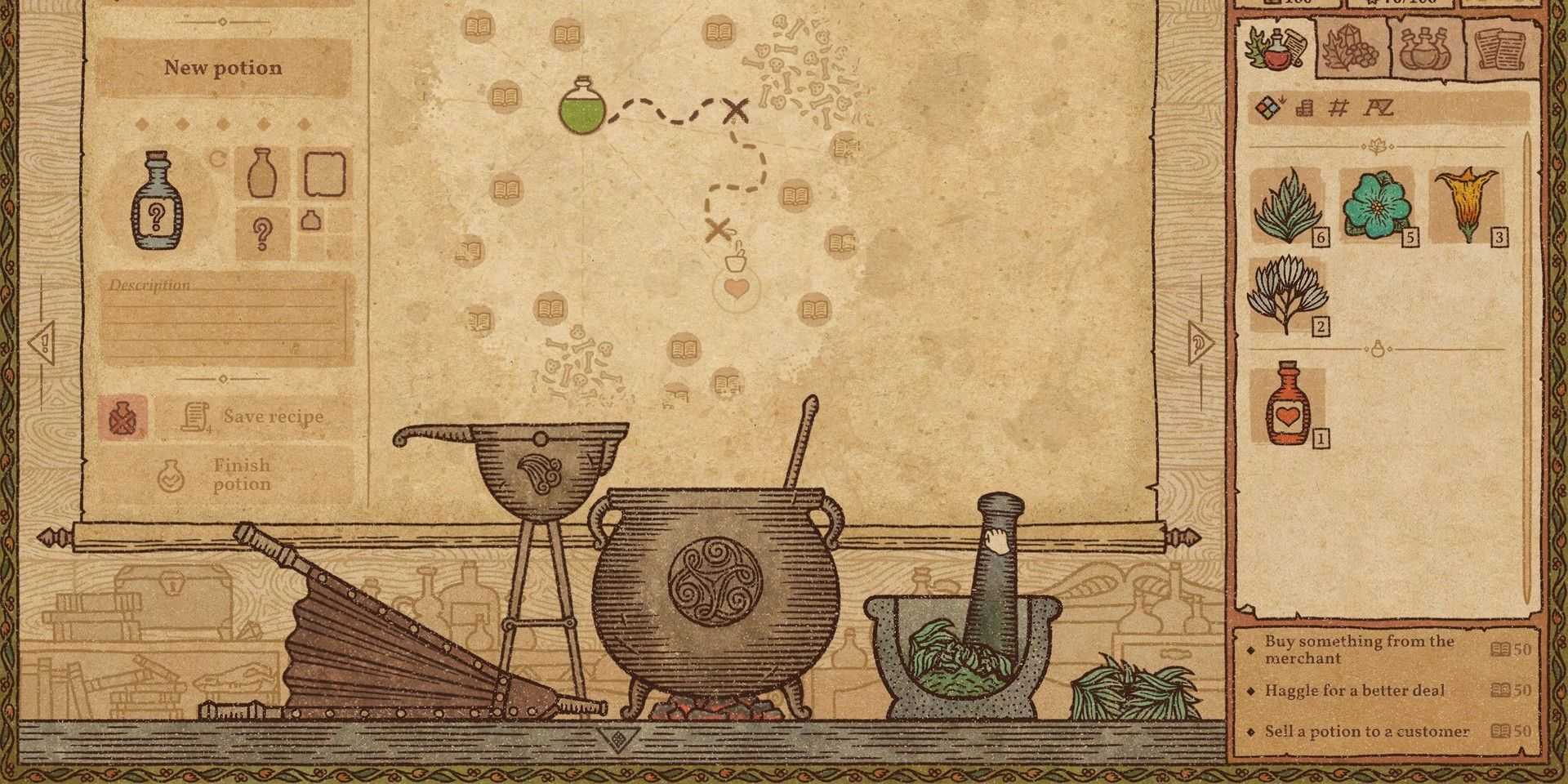 With its relaxing atmospheric from its subtle soundtrack to its gorgeous and medieval themed art style and illustrations, Potion Craft is a modern, quintessential alchemy video game.