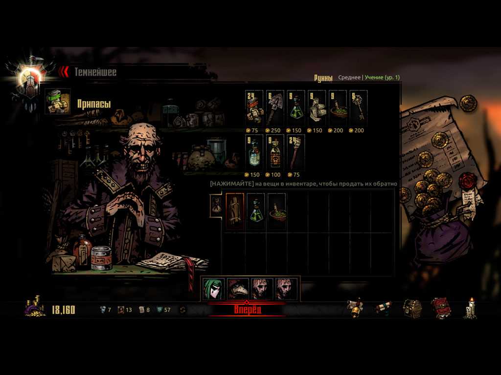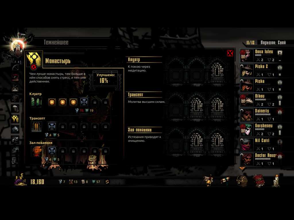 В какой ещё игре – герои от стресса отказываются идти на задания?! Вот вам обычная ситуация. Пошёл в подземелье – один герой вернулся с глистами, другой стал эгоистом и заболел анемией, третий стал трусом по жизни, а четвертый вообще отправился к праотцам. Одного лечишь, другого заставляешь молиться, а третий оказывается снимает стресс только самобичеванием… Ага, Darkest Dungeon постоянно держит игрока в тонусе! Герои только и успевают, что устранять свои собственные страхи и болезни. Тут не до прокачки…
