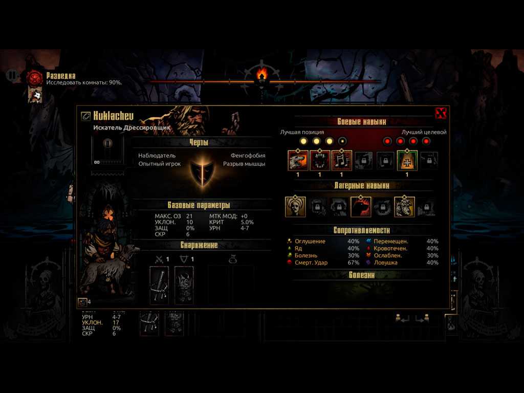 Всегда старайтесь выбирать маршрут так, чтобы не приходилось по несколько раз ходить по одному и тому же месту и получать лишний стресс. Если вам повезло с разведкой (на карте подсвечиваются сундуки, ловушки), то всегда внимательно следите за ловушками, они наносят солидное количество урона и накидывают много стресса. Ловушки старайтесь обезвреживать персонажами с наивысшим показателем «Ловушка» — правый столбец, последний ряд в меню персонажа.