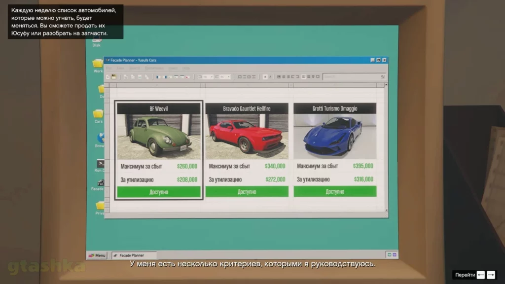 Теперь можно использовать компьютер. Всего для ограбления доступно 3 автомобиля. Каждую неделю этот список будет меняться. Угнанную бричку можно продать Юсуфу или разобрать на запчасти.