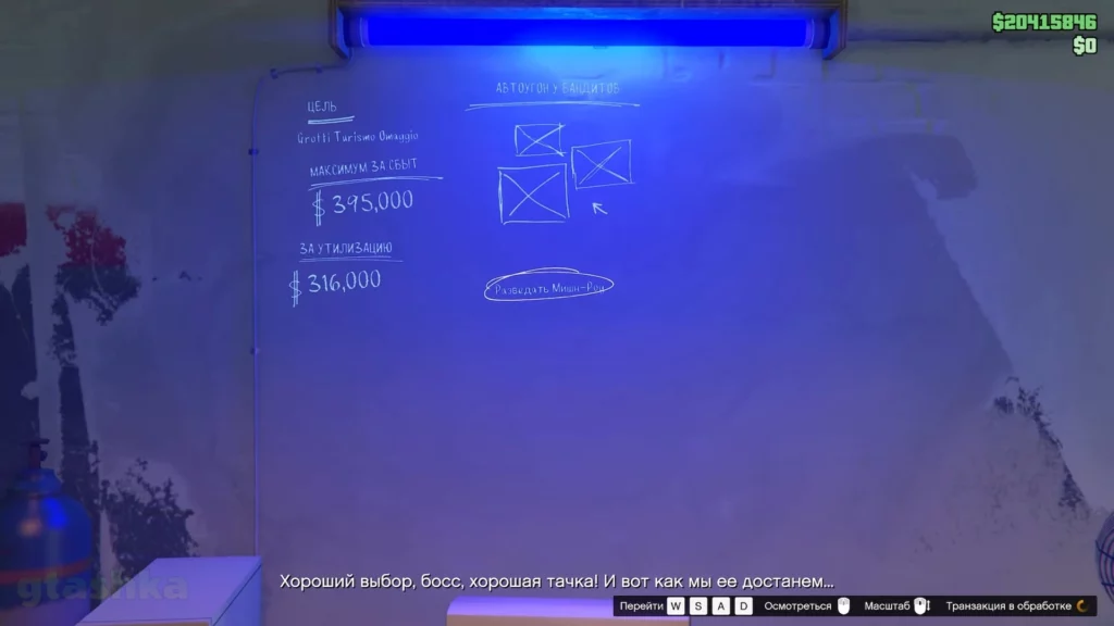 После выбора машины на стене отобразится план угона. На доске планирования вы можете увидеть всю информацию о грабеже, сколько денег будет получено за сбыт и утилизацию, а также название угона.