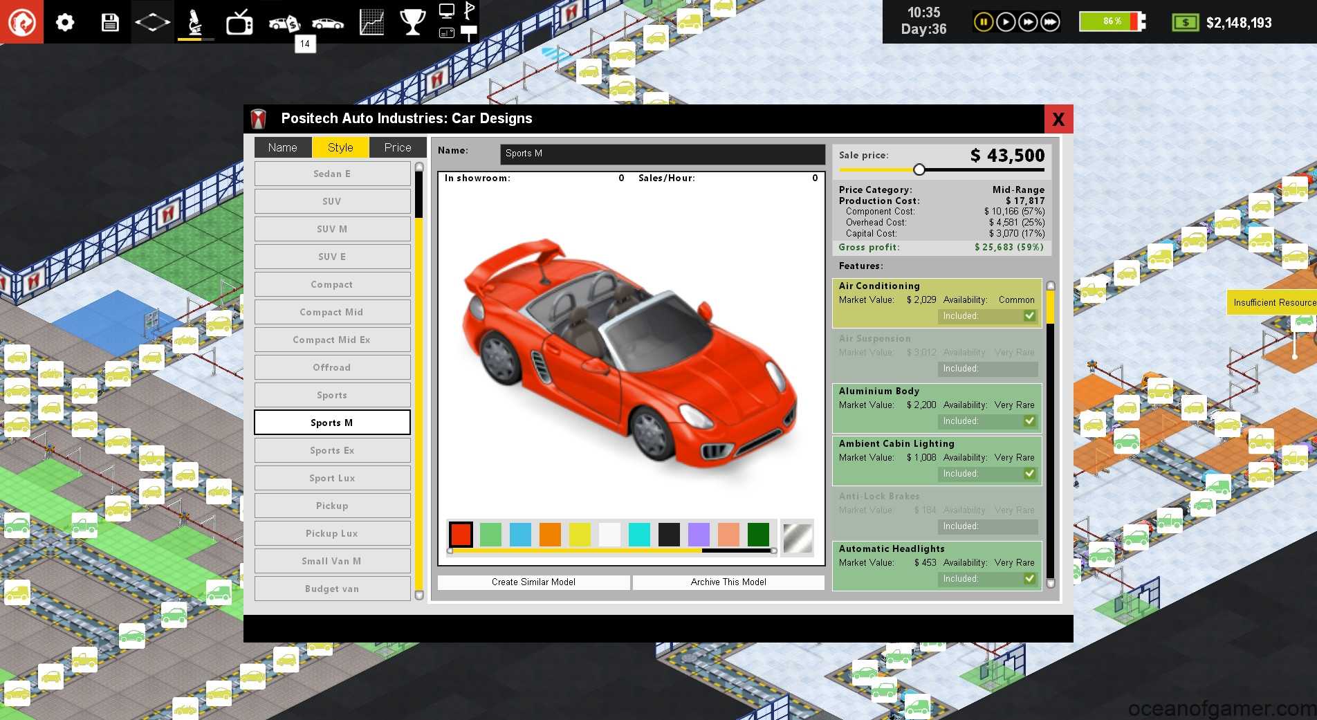 Production line is the new car factory management/simulation/tycoon game that pushes your organisational and entrepreneurship skills to the limit. Can you build the ultimate optimised, free-flowing car production line whilst beating the competition and still turn a profit? A modern car factory is a near perfect example of efficiency, process-management and flow. A massive army of precision-controlled robots dance to a milimeter-perfect ballet of engineering excellence with perfect timing. Components snake along conveyor belts to a just-in-time ordering system that leaves no pauses, no delay, no confusion or congestion. Nothing exists but the perfect flowing efficiency of high tech car construction… …in theory. In practice, of course, life is not so simple. When you get to grips with your first factory design, it certainly will not feel in a state of pure flow…or profit for that matter. Making a handful of built-to-order cars and breaking even is one thing…but competing with the big multinationals and churning out thousands of cars for the mass market is a whole new ballgame. To win market share from the big companies you are going to need planning, an appreciation of future technology, a careful eye on your bottom line, and an ability to design a factory layout that makes use of every square meter, and cuts production costs per car to the absolute minimum. Have you got what it takes to win? Production line is the new car factory management/simulation/tycoon game from Positech Games, the developers of Democracy & Gratuitous Space Battles, and publishers of Big Pharma. This game is designed to appeal to the efficiency geek in all of us, the person who cannot help but organize things for maximum performance. The closet entrepreneur, the stats-geek, Is that you? if so…welcome to your dream game (we hope!) The key to understanding production line is the division of labor and the merits of purpose-built machinery. At the start, your factory will be small and the individual slots on your production line will carry out large complex tasks (like fitting the car body). As you research better methods, and earn the funds to expand, you will continue to subdivide those slots into smaller (and faster) production areas which keep the flow of new vehicles flowing smoothly. At the same time, product design researchers will be working out how to enhance your cars with new technologies such as automatic headlights, power steering, bluetooth phone support and voice recognition.